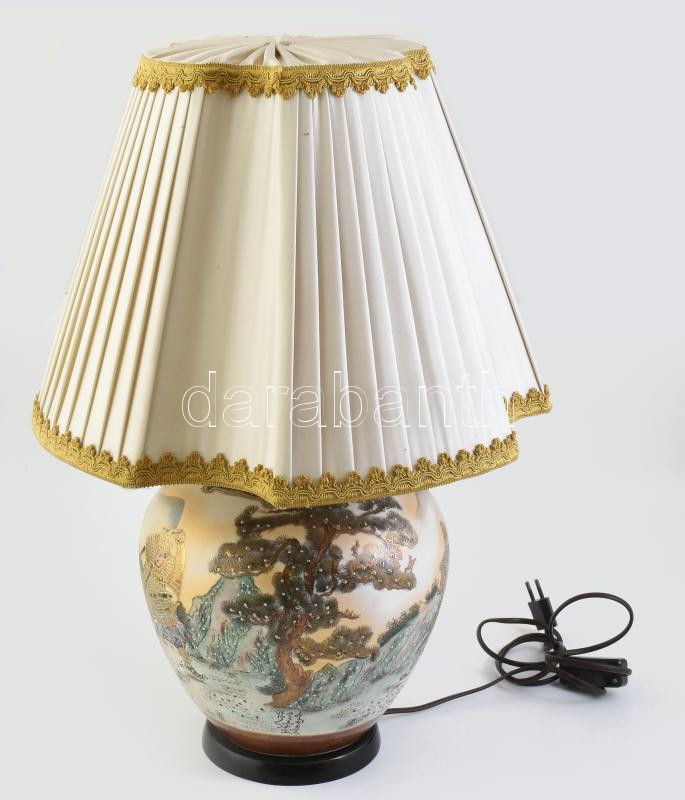 Beschreibung: Szacuma asztali lámpa. Japán, XX. sz. kézzel festett, minimális kopással. Hozzá selyem lámpabúra 56 cm
