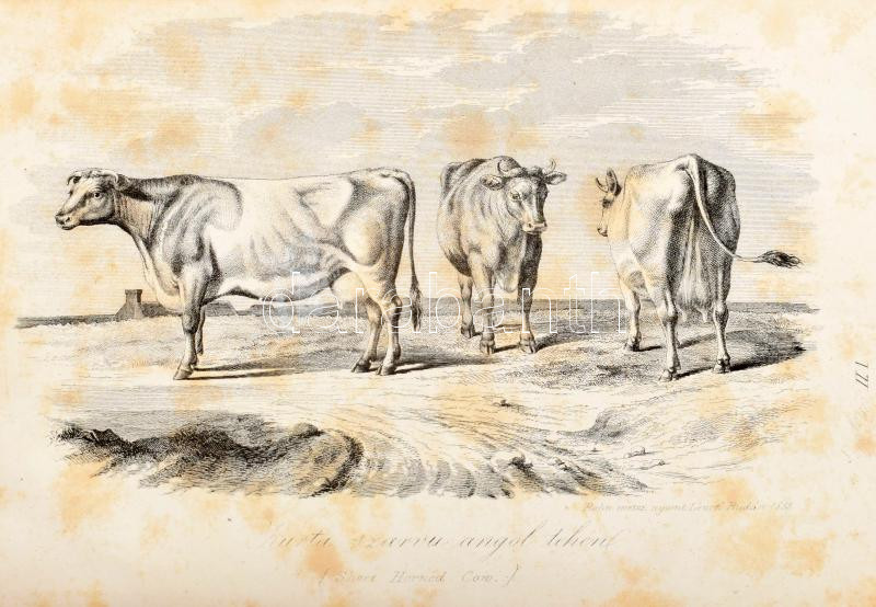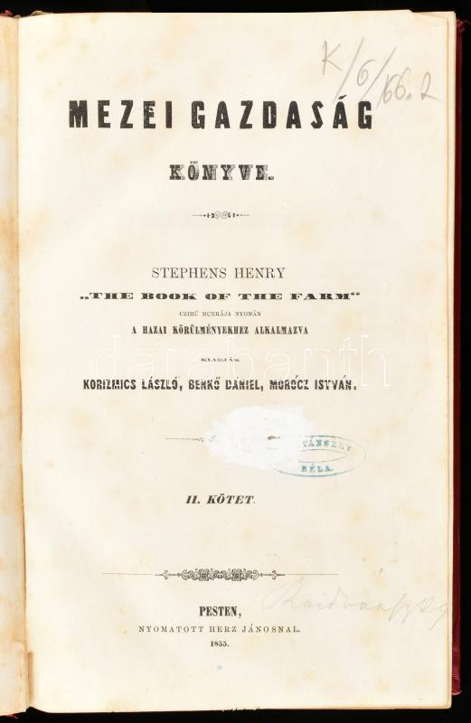 Stephens Henry: Mezei gazdaság könyve II. köt. - - "The book of the farm" czímű munkája nyomán a hazai körülményekhez alkalmazva. Kiadják Korizmics László, Benkő Dániel, Mórocz István. Pest, 1855., Herz János, 4+478+2 p.+4 (litográfiák) t. +1 (kihajtható táblázat) t. Szövegközti fametszetű illusztrációkkal. Korabeli aranyozott gerincű vaknyomásos egészvászon-kötésben, a borítón kopásnyomokkal, régi bélyegzésekkel, foltos lapokkal, a gerincen sérüléssel.