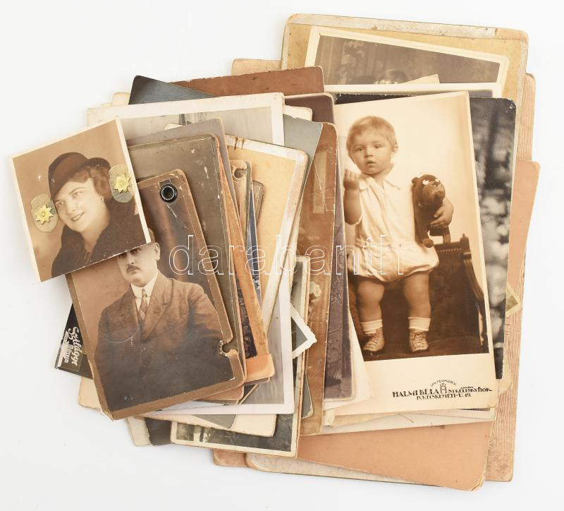 Beschreibung: Vegyes régi fotók: portrék, igazolványképek, gyerekek, kutya, esküvői, stb.; összesen kb. 44 db, vegyes méretben és állapotban