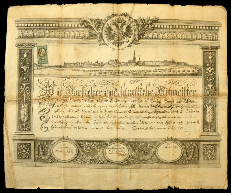 Beschreibung: 1875 Bécs, dekoratív mesterlevél (kocsimázoló, lakkozó), osztrák címerrel és a város látképével díszítve, okmánybélyeggel. Sérült, javított, 49x41 cm