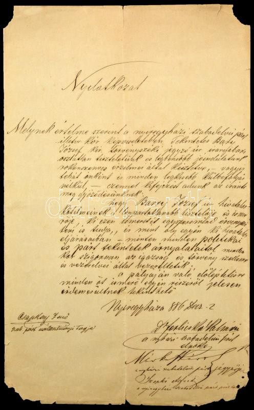 Beschreibung: 1886 Politikai megbízhatósági nyilatkozat Bary József kúriai bíró részére (Ferlicska Kálmán későbbi országgyűlési képviselő aláírásával).