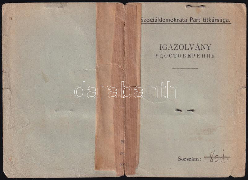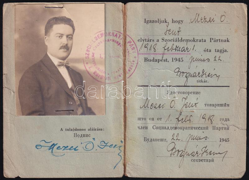 1945 Arcképes kétnyelvű szociáldemokrata pártigazolvány https://www.darabanth.com/de/439-Fernauktion/439.0/Kunst-Dokumente-andere-Sammelgebiete/Dokument~1000020/1945-Arckepes-ketnyelvu-szocialdemokrata-partigazolvany~II2880903