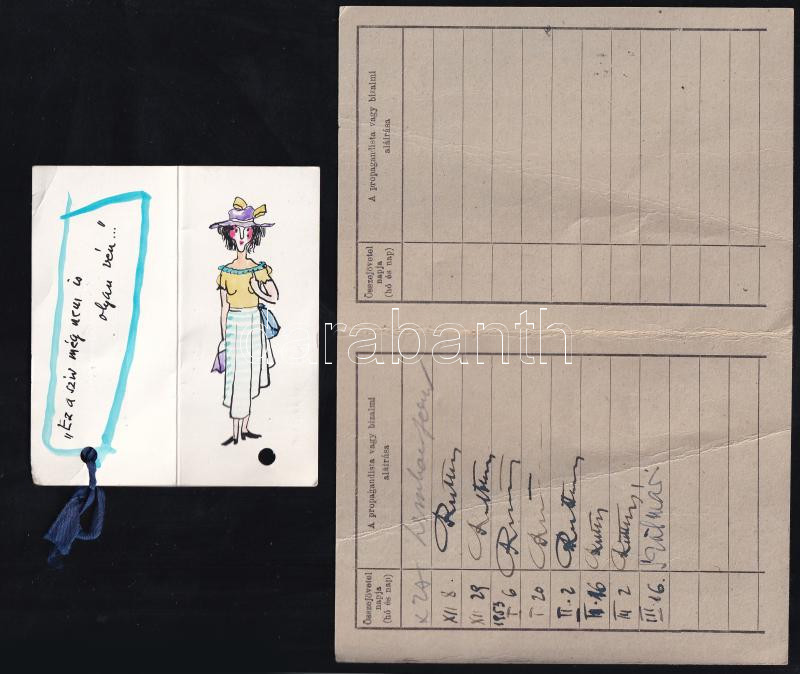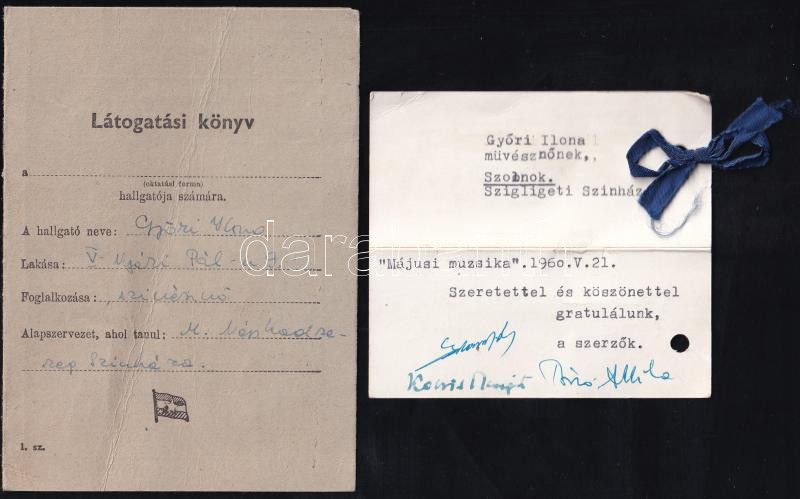 1952-1953 Győri Ilona (1929-2001) Jászai Mari-díjas magyar színművésznő látogatási könyve, Ruttkai Ottó (1921-1988) színházigazgató aláírásával. + 1960 Szigligeti Színház "Májusi Muzsika" c. darab bemutatójának kártyája, Galambos György, Kocsis Margit, Bíró Attila aláírásaival.