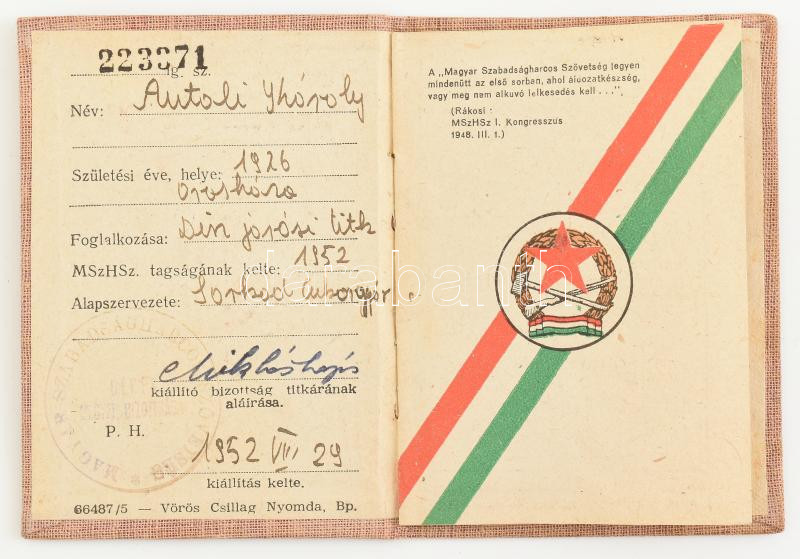 1952 Magyar Szabadságharcos Szövetség tagsági igazolvány, bélyegekkel https://www.darabanth.com/de/439-Fernauktion/439.0/Kunst-Dokumente-andere-Sammelgebiete/Dokument~1000020/1952-Magyar-Szabadsagharcos-Szovetseg-tagsagi-igazolvany-belyegekkel~II2885938