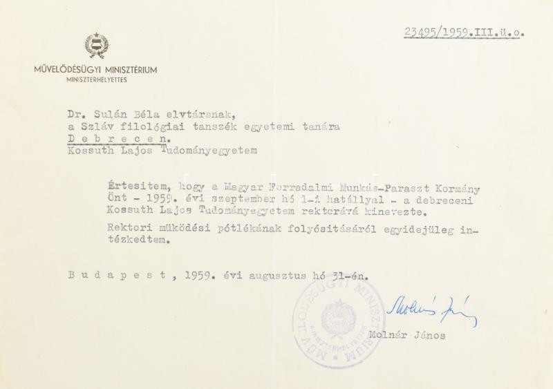 1959 A debreceni Kossuth Lajos Tudományegyetem rektorrá kinevező okira... https://www.darabanth.com/de/439-Fernauktion/439.0/Kunst-Dokumente-andere-Sammelgebiete/Dokument~1000020/1959-A-debreceni-Kossuth-Lajos-Tudomanyegyetem-rektorra-kinevezo-okirata-Dr-Sulan-Bela-resze~II2882590