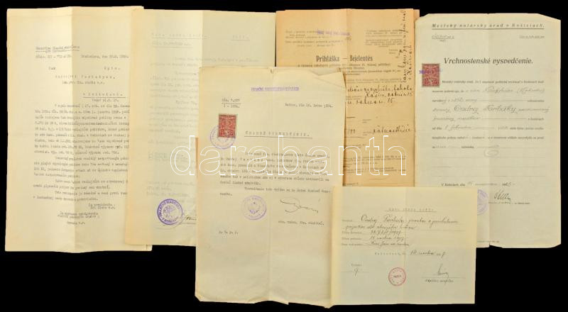 cca 1925 Kassa (Felvidék), vegyes iratok pénzügyi témában (hadikölcsönkötvények után járó kártérítés, stb.), magyar/szlovák nyelven, vegyes állapotban, kb. 10 db