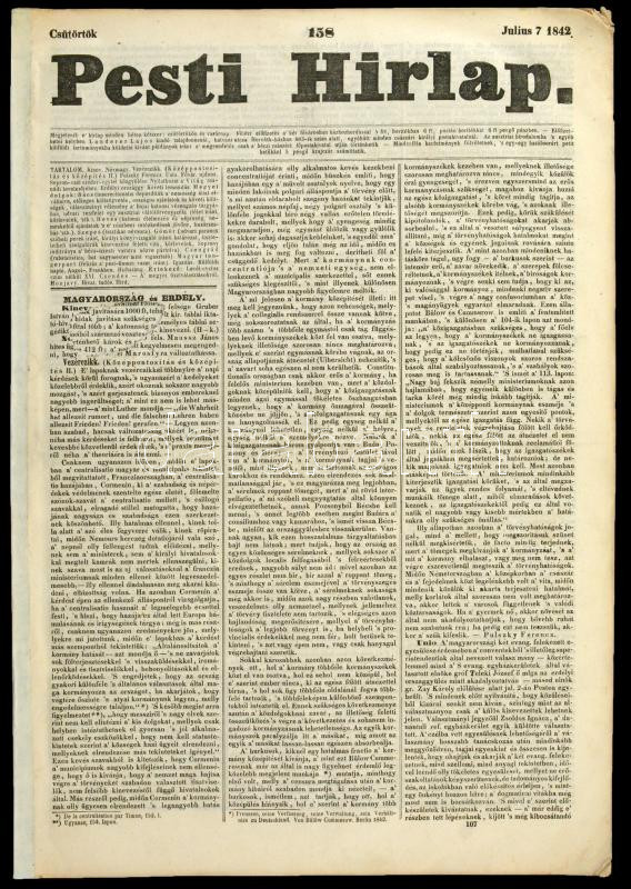 1842 Pesti Hírlap 158. sz. Julius 7. 1842. Szerk.: Kossuth Lajos. Pest, Landerer Lajos, restaurált, a felső sarkain kis hiányokkal, 472-480 p. Benne korabeli hírekkel, érdekes írásokkal, korabeli reklámokkal, közte Emich Gusztáv újonnan felállított könyvkereskedésének reklámjával, valamint gőzhajómenetrenddel, gabonaárakkal.