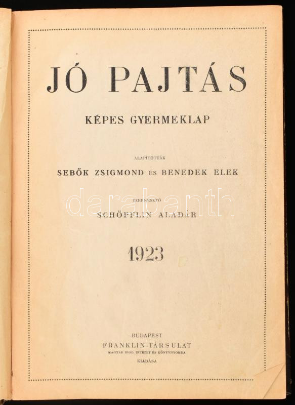 1923 Jó Pajtás képes gyermeklap. XV. évf. 1-36. sz. (teljes évfolyam). Szerk.: Schöpflin Aladár. Bp., Franklin-Társulat, (4)+434 p. Illusztrált félvászon-kötésben, kissé sérült, kopott borítóval, belül túlnyomórészt jó állapotban.