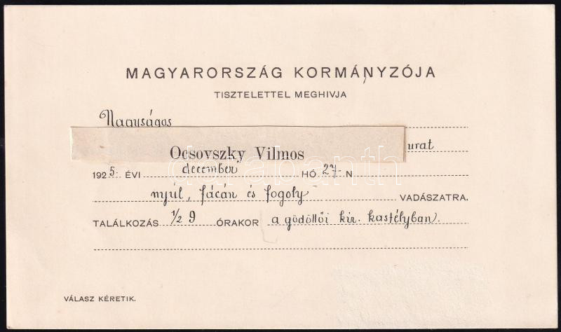 Beschreibung: 1926 Horthy Miklós kormányzó vadászatra szóló meghívója Ocsovszky Vilmos részére