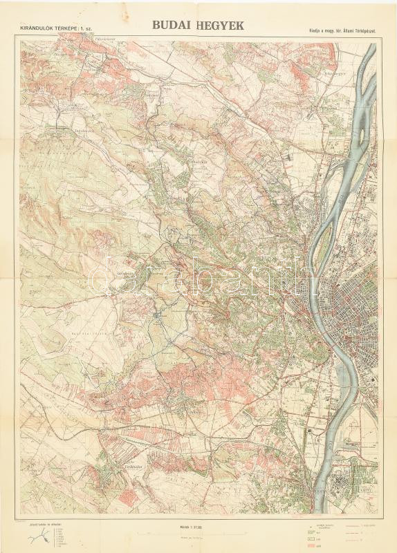 Beschreibung: cca 1928 Budai hegyek, Kirándulók térképe 1. sz., 1 : 37.500, Bp., M. kir. Állami Térképészet, 50x70 cm