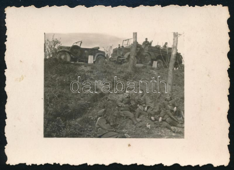 Beschreibung: cca 1942 Magyar katonák pihenője Oroszországban, támadási parancsra várva, fotó, hátoldalon felirattal, 6×8 cm