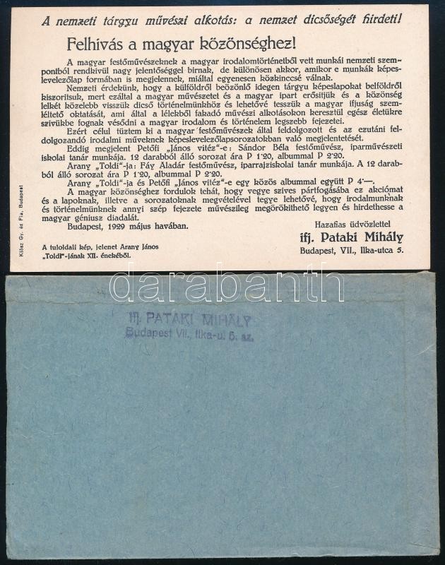 1929 Ifj. Pataki Mihály: "A nemzeti tárgyu művészi alkotás: a nemzet dicsőségét hirdeti! Felhívás a magyar közönséghez!", Bp., Klösz-ny., a másik oldalon Fáy András: Arany János Toldijához készült illusztrációval, 9x14 cm