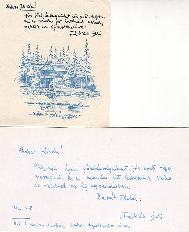 Beschreibung: Fábiám László költő üdvözlő sorai 2 db üdvözlőkártyán saját kezű aláírásával