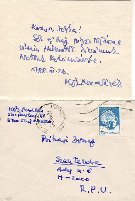 Beschreibung: Kós András szobrászművész levele Bihari Jószefnek a művész saját kezű aláírásával