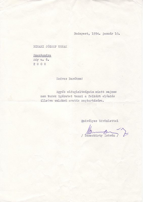 Beschreibung: Nemeskürthy István író levele saját kezű aláírásával