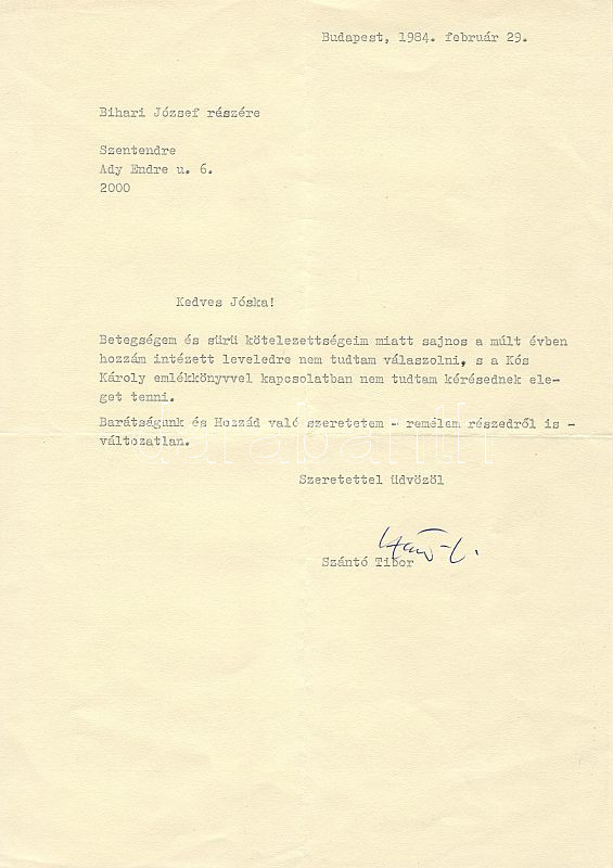 Beschreibung: Szántó Tibor író levele saját kezű aláírásával