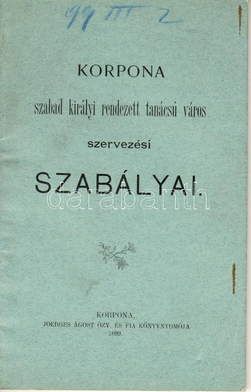 1899 Korpona szabad királyi rendezett tanácsú város szervezési szabál... https://www.darabanth.com/de/44-Fernauktion/44.0/Andere-Sammelgebiete/~253/1899-Korpona-szabad-kiralyi-rendezett-tanacsu-varos-szervezesi-szabalyai~II87029