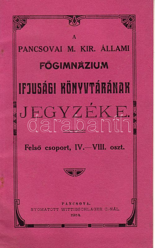 1914 A Pancsova M. Kir. állami főgimnázium ifjúsági könyvtárának jegyz... https://www.darabanth.com/de/44-Fernauktion/44.0/Andere-Sammelgebiete/~253/1914-A-Pancsova-M-Kir-allami-fogimnazium-ifjusagi-konyvtaranak-jegyzeke~II87044
