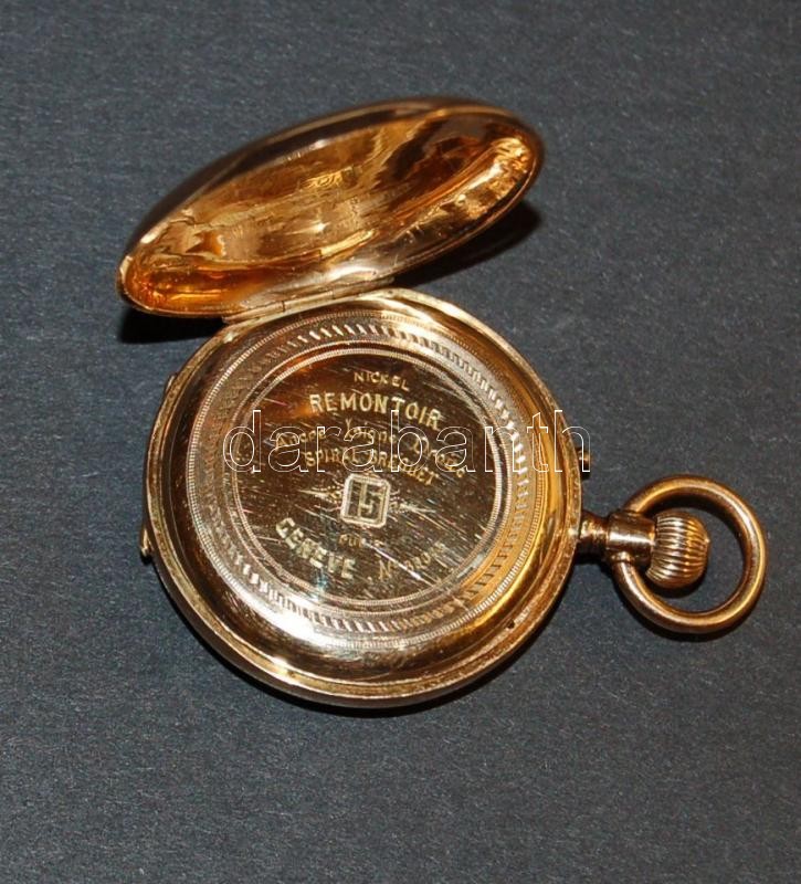 Beschreibung: Svájc cca századforduló "Remontoir Patent" 14K arany zsebóra 15 köves, működőképes 3,5cm átmérővel