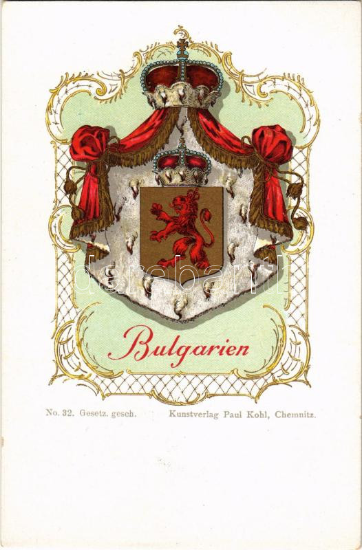 Bulgarien / Bulgarian coat of arms. Paul Kohl (Chemnitz) No. 32. Art N... https://www.darabanth.com/de/44-Gross-Auktion/44.1/Ansichtskarten/Bulgarien~18276/Bulgarien-Bulgarian-coat-of-arms-Paul-Kohl-Chemnitz-No-32-Art-Nouveau-litho~II3289205