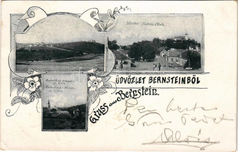 Borostyánkő, Bernstein; Alsó tér, vár, Katolikus templom és villa / Unterer Platz, Katholische Kirhce u. Villa / square, castle, Catholic church and villa. Art Nouveau, floral (EB)