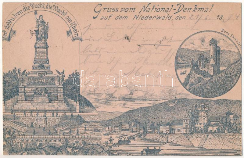 Beschreibung: 1894 (Vorläufer) Rüdesheim am Rhein, National-Denkmal auf dem Niederwald, Burg Ehrenfels, Fest steht u. treu die Wacht am Rhein / monument, castle (cut)