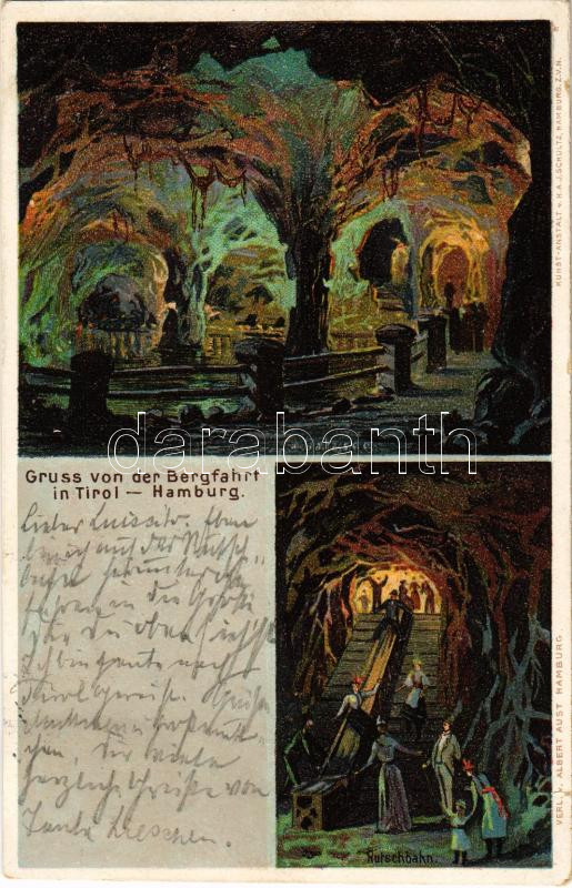 Beschreibung: 1901 Hamburg, Gruss von der Bergfahrt in Tirol, Rutschbahn / ghost train ride, slide. Kunst-Anstalt v. H. A. J. Schultz litho (small tear)