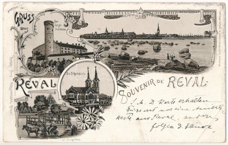 Beschreibung: 1898 (Vorläufer) Tallinn, Reval; Der Lange-Hermann, Die St. Karlskirche, St. Brigitten. Art Nouveau, floral, litho (EB)