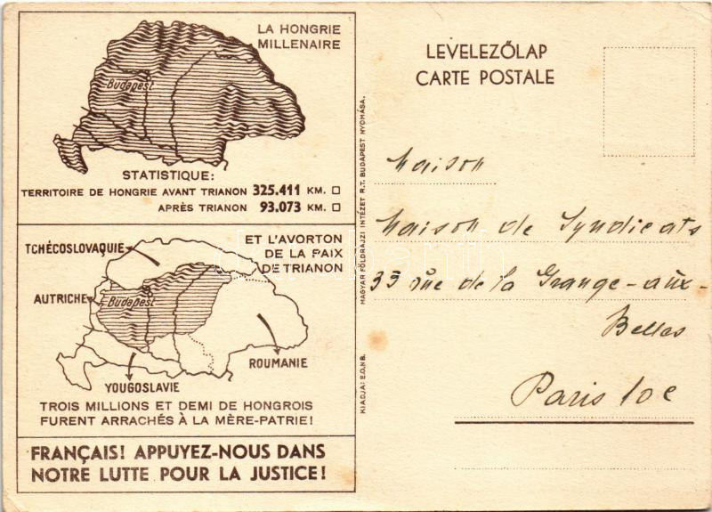 Concorde tér Párizsban és a Szabadság tér Budapesten. Trianon irredenta szoborcsoport, Országzászló. Magyar Földrajzi Intézet rt. nyomása / Paris, Place de la Concorde - Budapest, Place de la Liberté; Hungarian irredenta propaganda, Trianon map on the backside (EK)