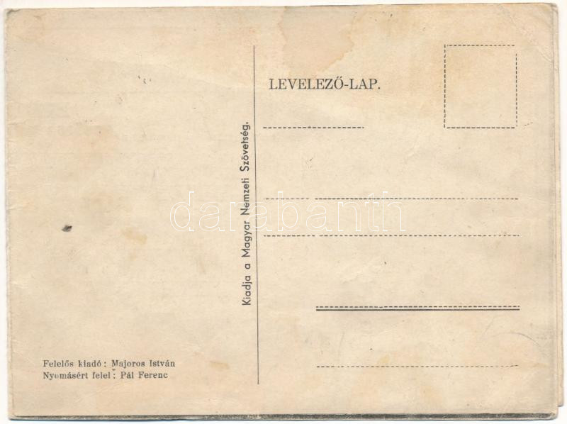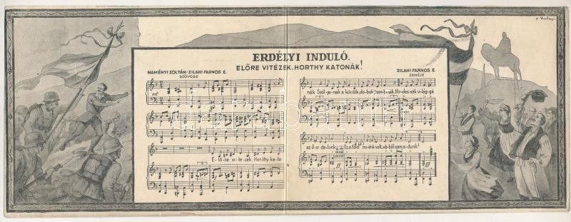 Erdélyi induló. Előre vitézek, Horthy katonák! Zilahi Farnos E. zenéje, Naményi Zoltán-Zilahi Farnos E. szövege. Kiadja a Magyar Nemzeti Szövetség. 2-részes kinyitható irredenta kottás képeslap / WWII Hungarian Army's Transylvanian military anthem, irredenta propaganda, 2-tiled folding card with sheet music s: Buday (EB)