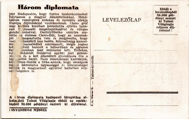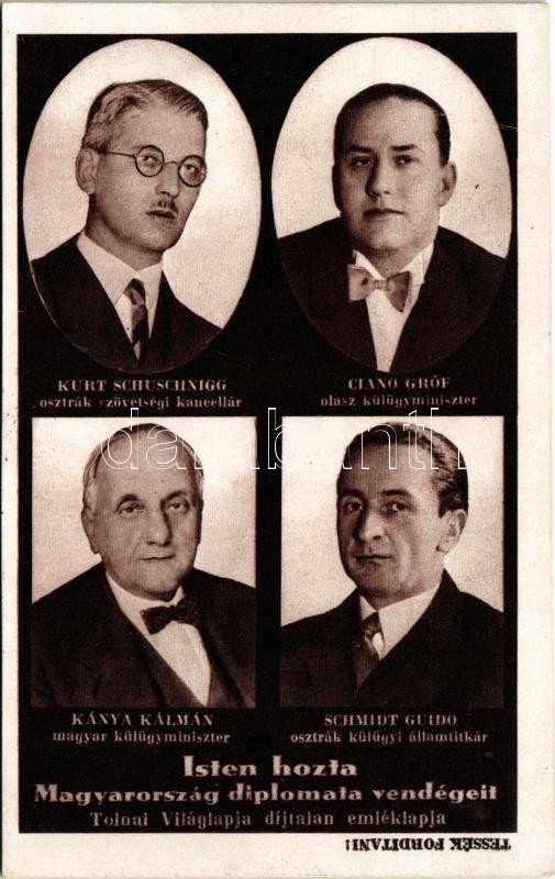 Isten hozta Magyarország diplomata vendégeit! Kurt Schuschnigg osztrák szövetségi kancellár, Ciano gróf olasz külügyminiszter, Kánya Kálmán magyar külügyminiszter, Schmidt Guido osztrák külügyi államtitkár. Tolnai Világlapja (fa)