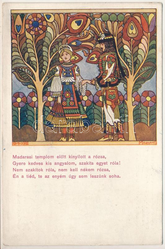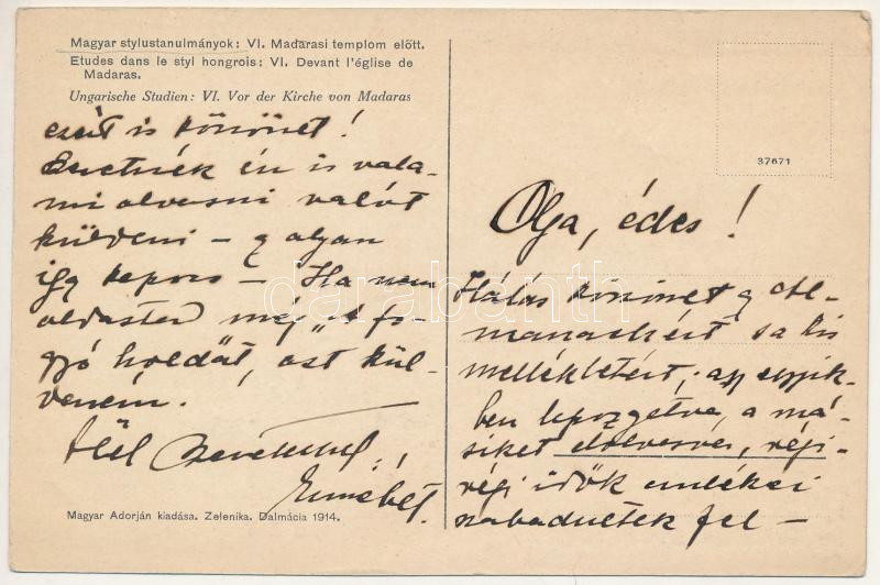 Magyar stylustanulmányok VI. Madarasi templom előtt. Magyar Adorján kiadása (Zelenika, Dalmácia 1914) / Ungarische Studien VI. / Hungarian folklore art postcard s: Magyar (EK)