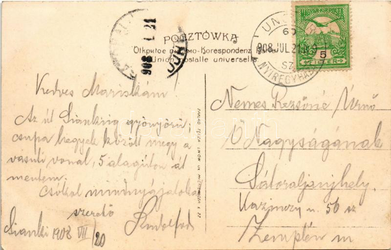 Beschreibung: 1908 Hajasd, Voloszjanka, Volosyanka; vasúti híd, viadukt / railway bridge + "UNGVAR - NYÍREGYHÁZA 60. SZ." vasúti mozgóposta bélyegző