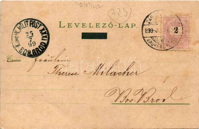 1899 (Vorläufer) Zagreb, Zágráb; Jelacicev trg, Akademicki trg, Drzavni kolodvor, Kazaliste / Jellasics tér, Akadémia tér, vasútállomás, színház / squares, railway station, theatre. Art Nouveau, floral, litho (gyűrődés / crease)