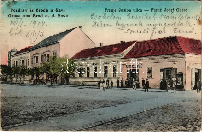 1914 Bród, Nagyrév, Slavonski Brod, Brod na Savi; Franje Josipa ulica. C. Bencevic / Franz Josef Gasse / Ferenc József utca, C. Bencevic üzlete / street, shop (fl)