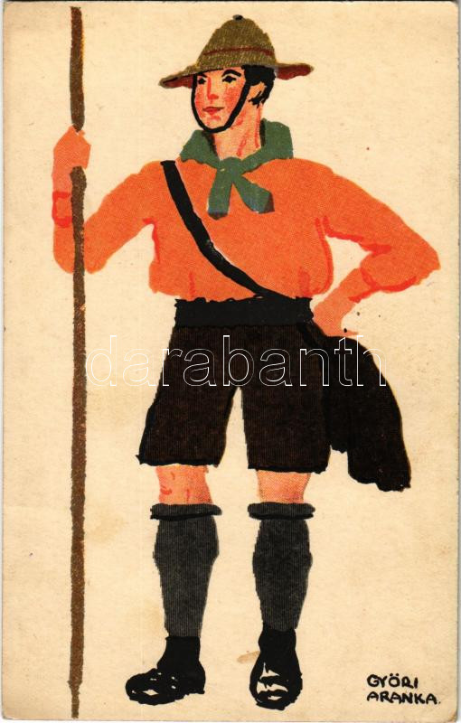 Cserkész művészlap. A fáradtságnak fittyet hányok: Diana sósborszeszt használok! / Hungarian boy scout art postcard. Advertisement on the backside s: Győri Aranka (fl)