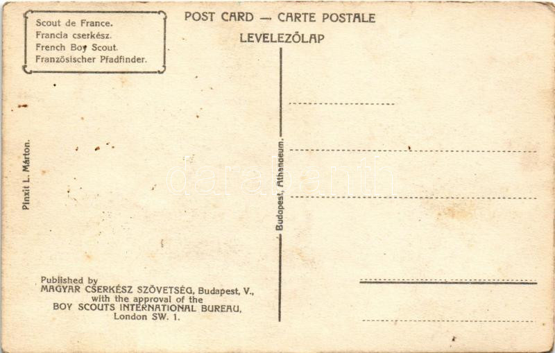 Francia cserkész. Kiadja a Magyar Cserkészszövetség / French Boy Scout... https://www.darabanth.com/de/44-Gross-Auktion/44.1/Ansichtskarten/Pfadfinder~18224/Francia-cserkesz-Kiadja-a-Magyar-Cserkeszszovetseg-French-Boy-Scout-Boy-Scouts-International~II3327252