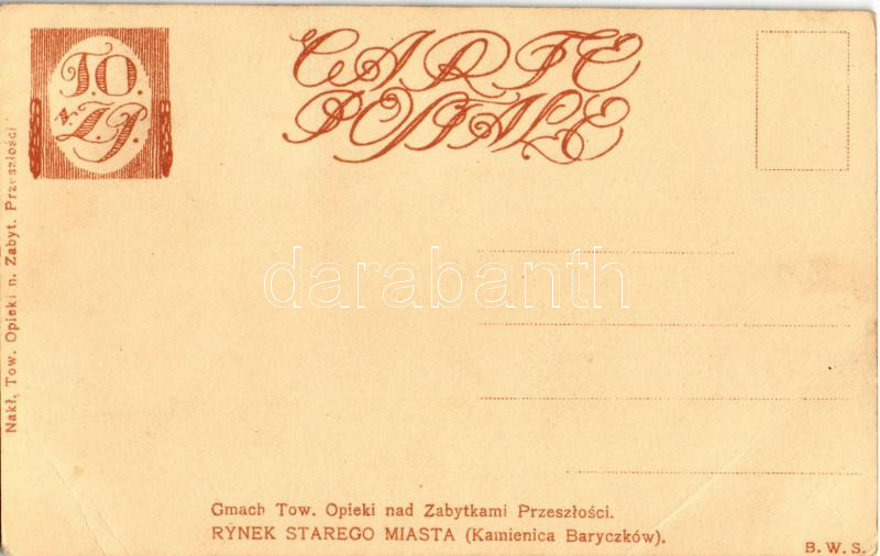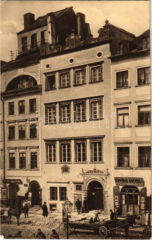Warszawa, Warschau, Warsaw, Varsó; Kamienica Baryczków, Rynek Starego Miasta, Droby, Kawiarnia H. Fridman. Gmach. Tow. Opieki nad Zabytkami Przeszlosci / shop, cafe, road construction (EB)