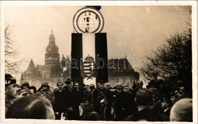 1938 Kassa, Kosice; bevonulás, Vitéz Nagybányai Horthy Miklós kormányzó és felesége Purgly Magdolna, magyar címer / entry of the Hungarian troops, Regent Horthy and his wife, Hungarian coat of arms. photo (fl)