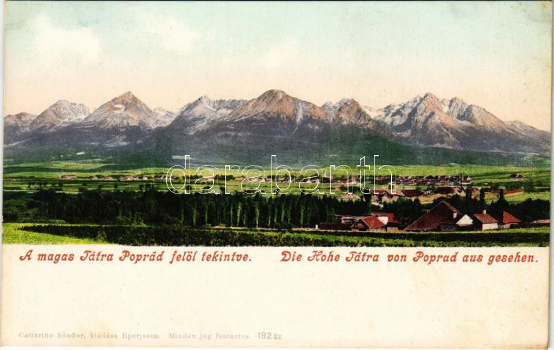 Tátra, Magas-Tátra, Vysoké Tatry; Poprád felől. Cattarino Sándor kiadá... https://www.darabanth.com/de/44-Gross-Auktion/44.1/Ansichtskarten/Slowakei~18211/Tatra-Magas-Tatra-Vysoke-Tatry-Poprad-felol-Cattarino-Sandor-kiadasa-192-general-view~II2885476