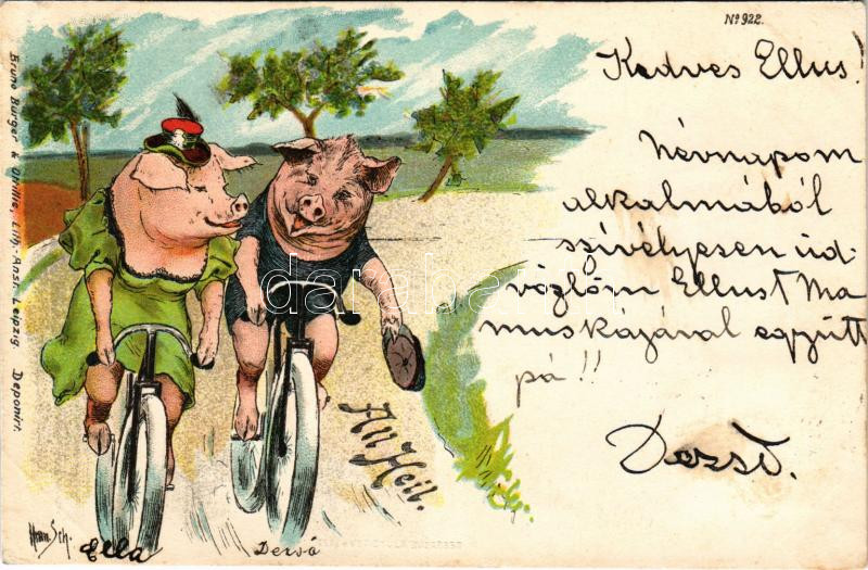 1898 (Vorläufer) All Heil / Kerékpározó malacok / pigs riding on bicyc... https://www.darabanth.com/de/44-Gross-Auktion/44.1/Ansichtskarten/Sport~18254/1898-Vorlaufer-All-Heil-Kerekparozo-malacok-pigs-riding-on-bicycles-Bruno-Burger-amp-O~II3348067