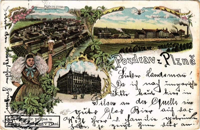 1899 (Vorläufer) Plzen, Pilsen; Mestansky pivovar, Spolecensky pivovar / brewery, beer factory, lady with a pint of beer. Art Nouveau, floral, litho (tear)