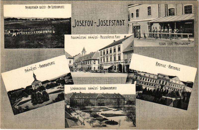 Josefov, Josefstadt (Jaromer, Jermer); Na vojenském cvicisti, Novomestske námesti, Hostinecutrilip, Hlavni stráz, Schonaichovo námesti, Radnice / am Exerzierplatz, Neustädter platz, Hauptwache, Paradeplatz, Schönaichplatz, Rathaus / military training ground, guards, K.u.K soldiers, squars, town hall. Al. Nemecek