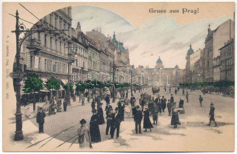 Beschreibung: Praha, Prag, Prague; Der Wenzelsplatz. B. Styblo / street view, shops. F. J. Jedlicka 902./1918