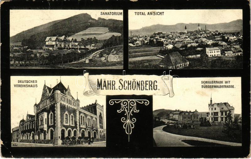 Sumperk, Mährisch Schönberg; Deutsches Vereinshaus, Sanatorium, total ansicht, Schillerpark mit Bürgerwaldstrasse German Clubhouse, sanatorium, park, street view, general view. J. Sandmann Art Nouveau (kopott sarkak / worn corners)