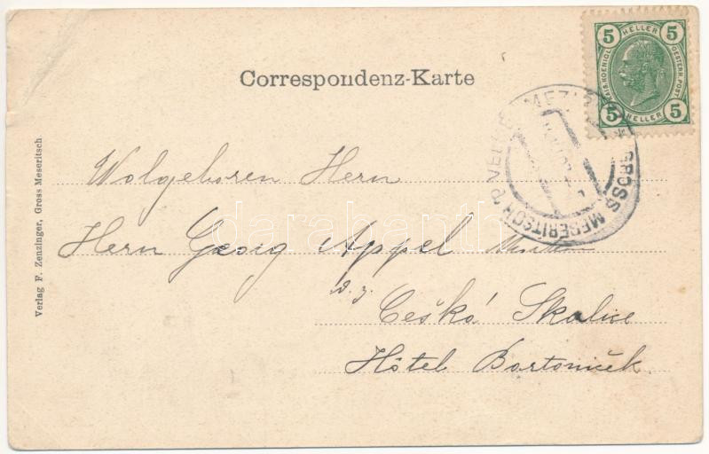 Velké Mezirící, Gross Meseritsch; F. Zenzinger Art Nouveau, floral lit... https://www.darabanth.com/de/44-Gross-Auktion/44.1/Ansichtskarten/Tschechische-Republik~18279/Velke-Mezirici-Gross-Meseritsch-F-Zenzinger-Art-Nouveau-floral-litho-EB~II3124735