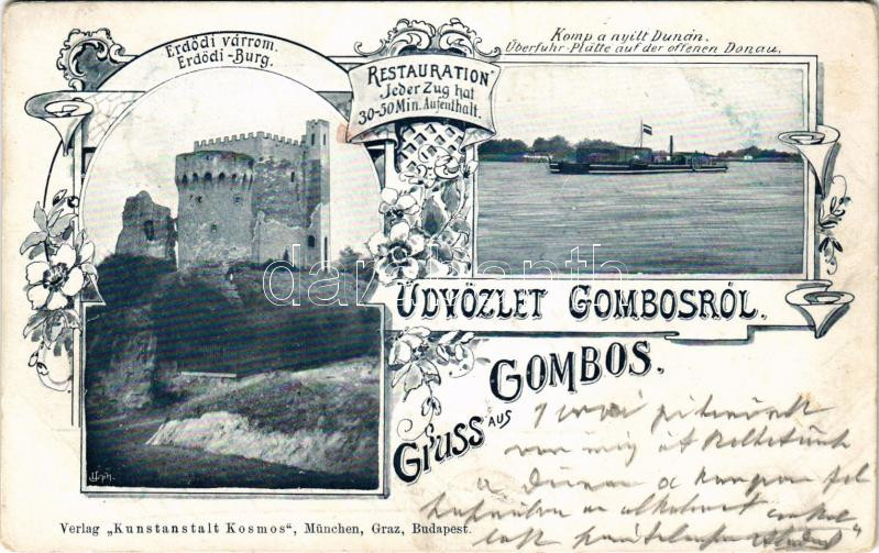Beschreibung: 1899 (Vorläufer) Gombos, Bogojeva; Erdődi várrom, Komp a nyílt Dunán / Erdődi-Burg, Überfuhr-Plätte auf der offenen Donau. Verlag Kunstanstalt Kosmos / castle, ferry. Art Nouveau, floral (EB)
