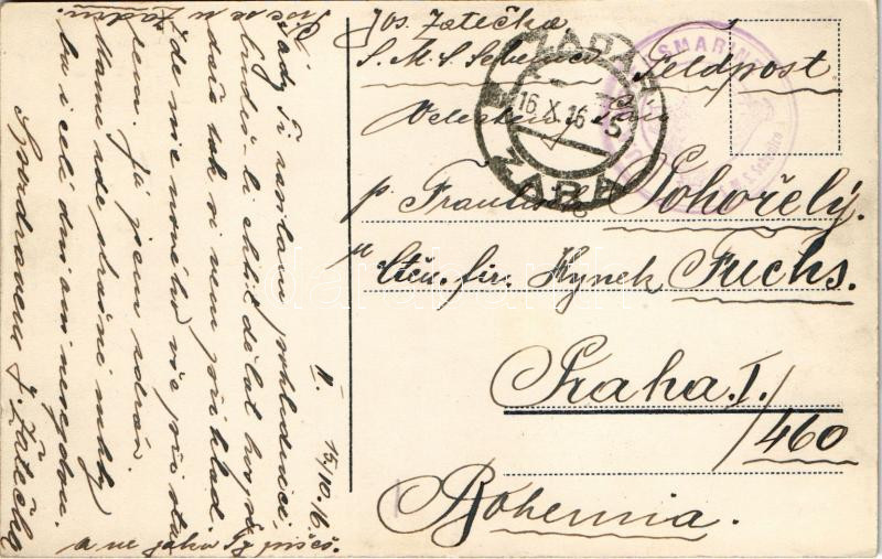 Beschreibung: 1916 Pred úpalem, vetru váním vlhkost pudy vzdycky chráním, na strnisko draslo dám, hned po sklizni podmítám / Cseh mezőgazdasági kálium reklámja / Czech agricultural potassium advertisement. litho + "K.U.K. KRIEGSMARINE SMS SEBENICO"