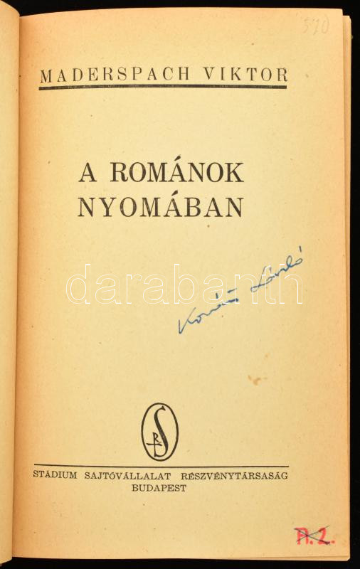 Maderspach Viktor: A románok nyomában. Julier Ferenc előszavával. 1942-es, a Magyar Cserkész által, szorgalom jutalmából, ajándékozott kötet! Bp., [1940.], Stádium, 270 p.+1 (kihajtható térkép) t. A térkép-mellett kézzel rajzolt térkép-vázlat. Kiadói egészvászon kötés, a borítón kis foltokkal.