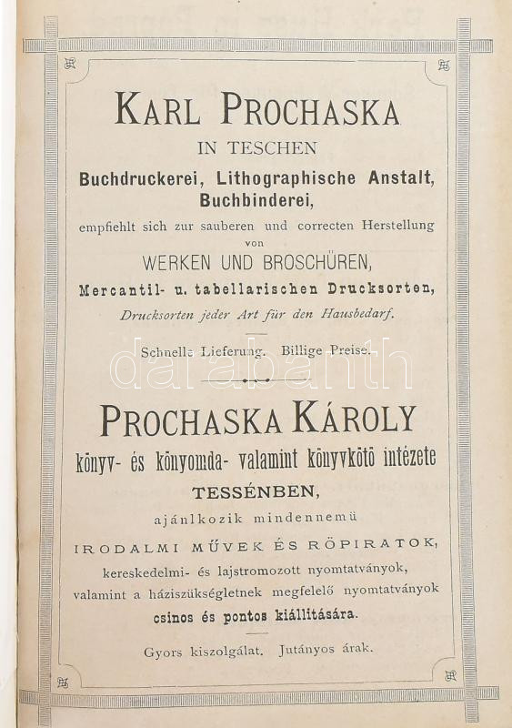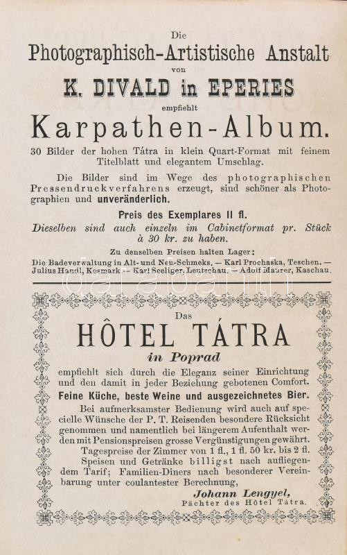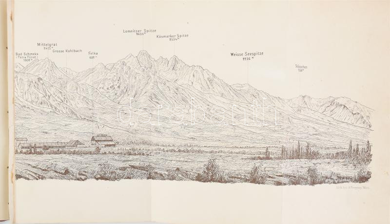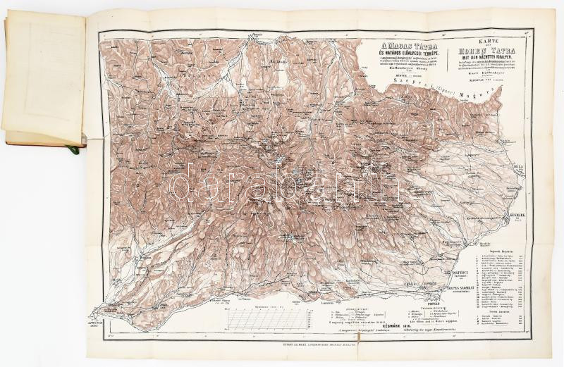 Karl Kolbenheyer: Die Hohe Tatra. Unter Mitwirkung mehrerer einheimischer Kenner und Freunde der Tatra von - -, k. k. Professor. Teschen, 1878, Karl Prochaska, 8+149 p.+ 1 (A Magas Tátraés határos előalpesei térképe. A Magyarországi Kárpátegylet" megbízásából a cs. és kir. vezénykar eredeti felvétele nyomán rajzolta és mások valamint saját leghitelesebb magasságméréseivel ellátta: Kolbenheyer Károly tanár. Karte der Hohen Tatra mit den nächsten Voralpen. ... Késmárk, 1876, "Magyarországi Kárpátegylet", (Bielitz, Eduard Klimek's Litographische Anstalt), 1:100,000, magyar és német nyelvű térkép, litográfia, javított, a szélén szakadt, sérült, 38x55 cm) t. Benne egy kijáró panorámaképpel, ami feltehetőleg nem a kiadvány része! Kiadói aranyozott egészvászon-kötés, kopott borítóval.